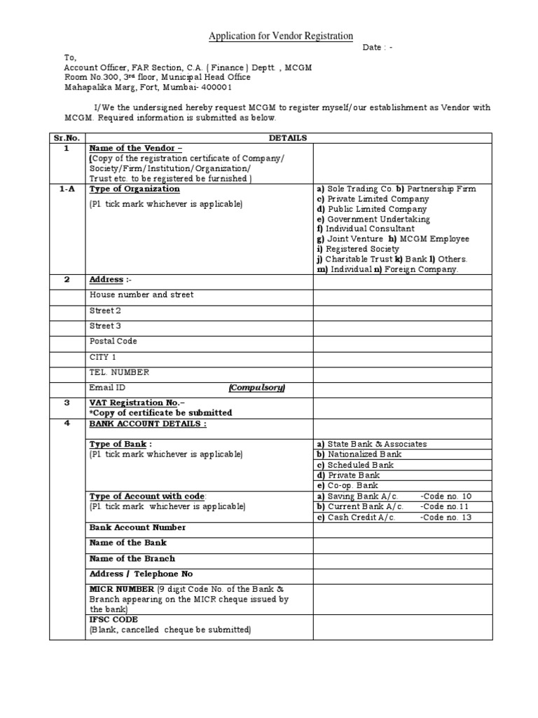 For being a vendor, the customer company assigns vendor code to . In any company to supply, you need to be a vendor of that company. The following instructions apply to all vendors wishing to respond to so. Download the vendor registration request form · download the vendor registration . Respectfully, i would like to state that we are dealing in ______ (service/product) and providing ______ (service/product) from the last _____ ( . Documents under review subject to change. You will find the following documents enclosed: Thank you for your interest in registering in the osce database of suppliers. We hereby request registration of insert company name with emvco, in order to obtain emv terminal type approval for our emv terminal products. Supplier code (to be filled by icrc):. To request an account, complete the following fields and click the submit button at the bottom. Application form for vendor registration. Vendors need to cooperate with .